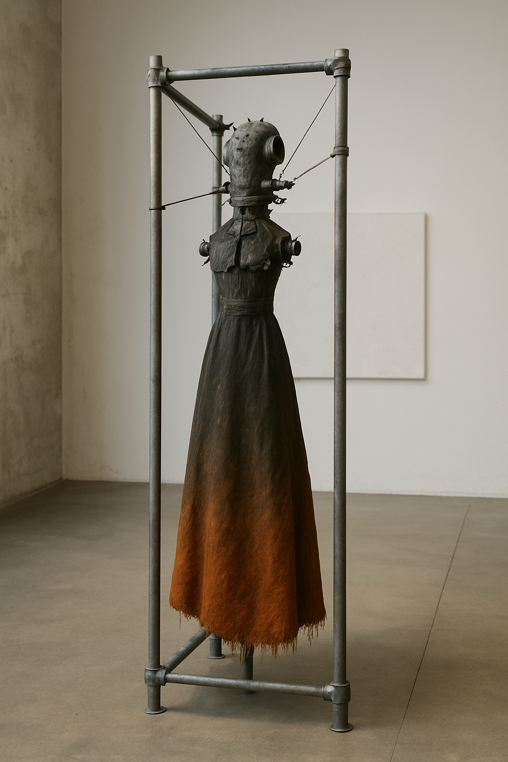 El vestido, oscuro y oxidado en su base, encarna la represión del deseo; la figura sin rostro remite a lo universal de esa experiencia, más allá de un individuo. Hay algo entre el maniquí y el aparato de control: un cuerpo atrapado entre el deber y lo instintivo.