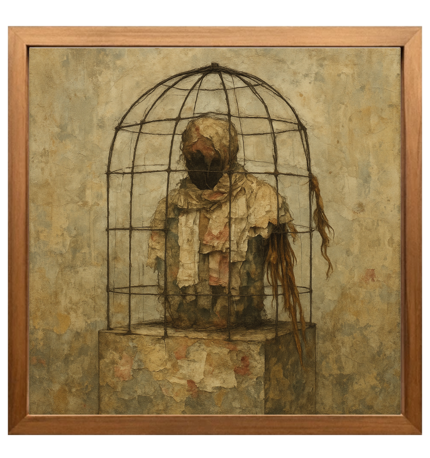 El personaje, encerrado en una jaula, sugiere una identidad velada, atrapada, imposible de alcanzar con la conciencia racional. La oscuridad del rostro remite al vacío, al miedo a lo que no tiene forma, pero también a una potencialidad latente: lo que aún no ha sido visto, lo que espera ser reconocido.
