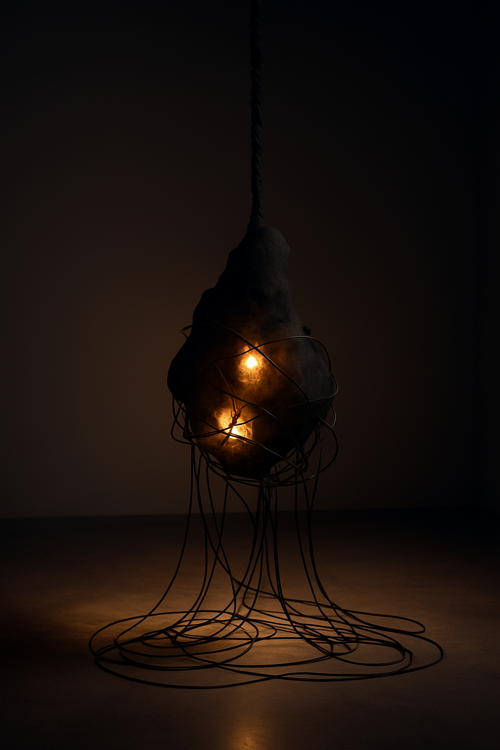 En estas esculturas, lo oscuro se manifiesta como encierro, como fuga, como vestigio. Telas que emergen de jaulas, fotografías de infancia que sangran, estructuras que parecen cuerpos fragmentados o mentes atrapadas. El sueño, en este contexto, es una puerta hacia lo reprimido, pero también hacia lo verdadero.